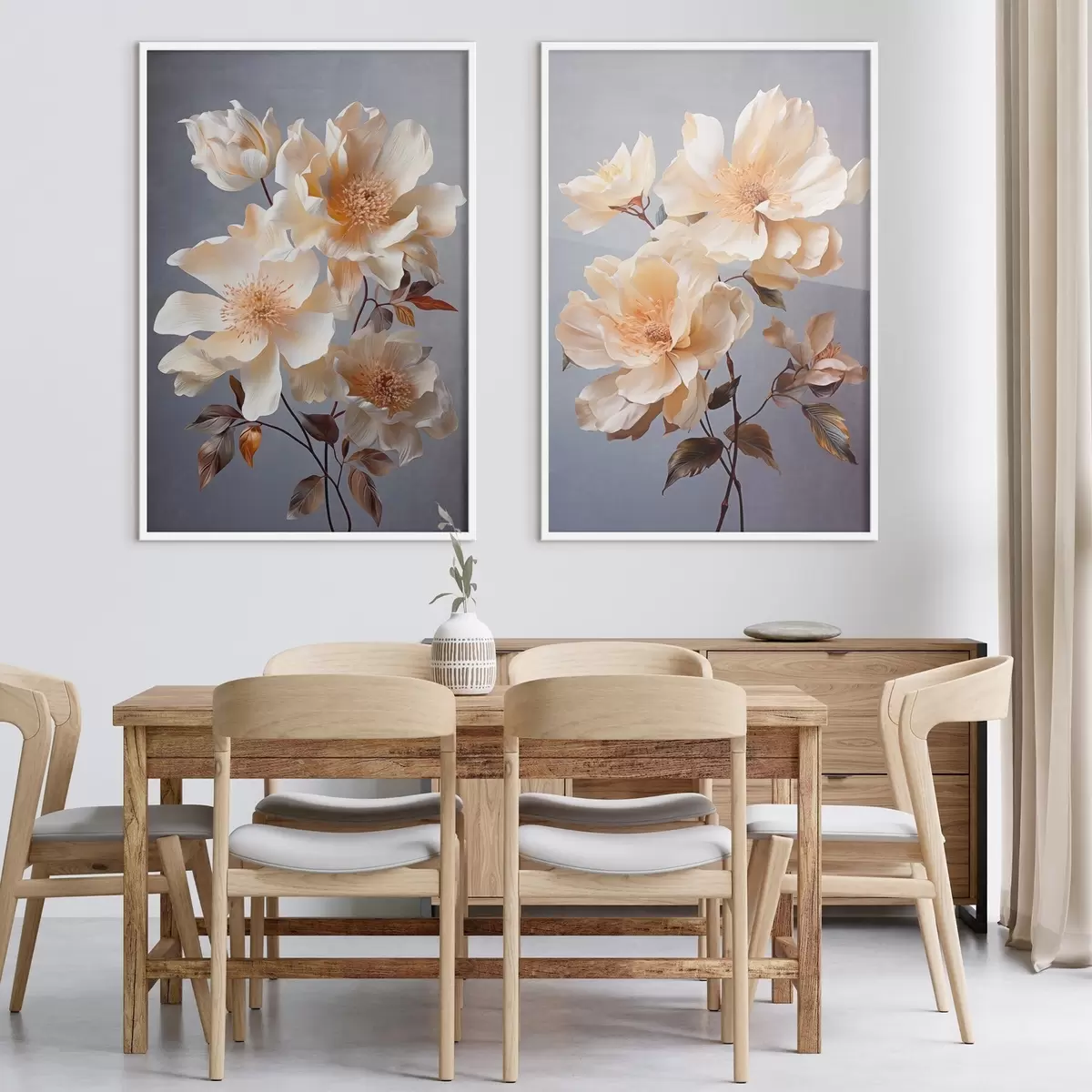 Poster Gestructureerde bloemen met oranje stampers en oranje bladeren op grijze achtergrond, zacht licht, elegant, gedetailleerd, realistisch d00525