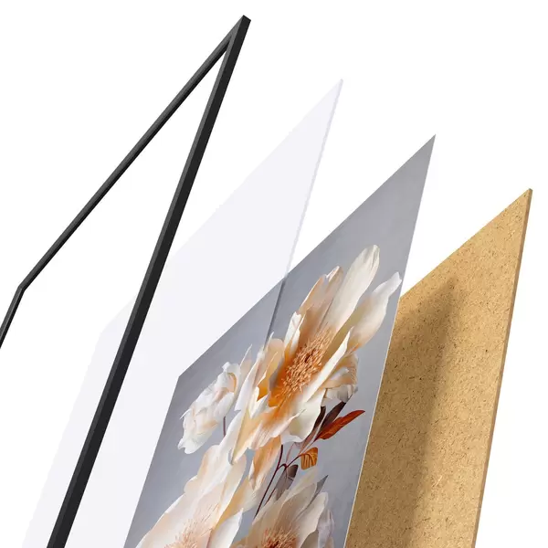 De poster bestaat uit een frame, plexiglas, geprinte afbeelding en spaanplaat achterkant. De poster kan meteen aan de muur worden gehangen dankzij de bevestigingen op de achterkant.