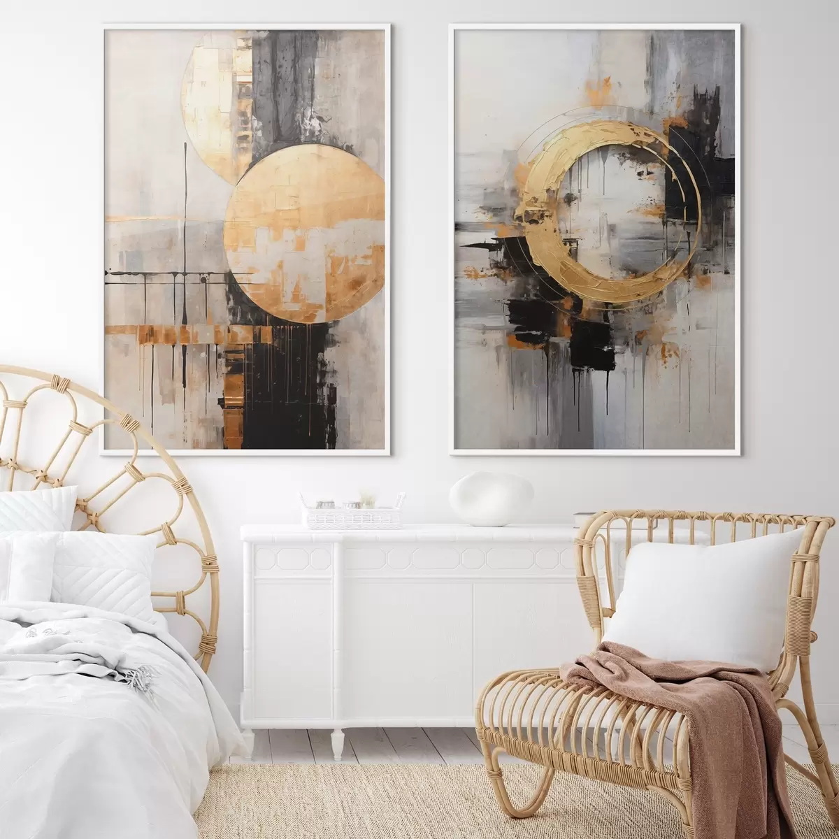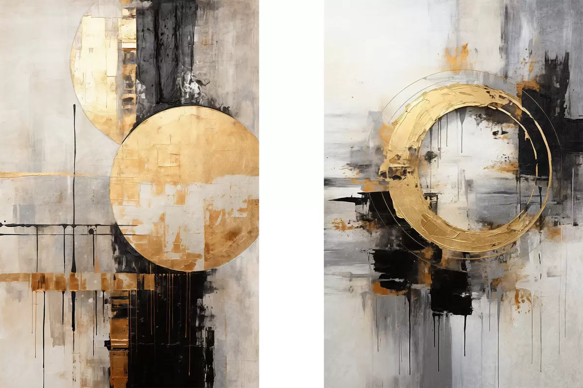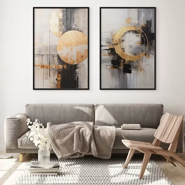 Poster Abstract schilderij met cirkels, zwarte en gele lijnen en een achtergrond met grijze en witte tinten N° d00527