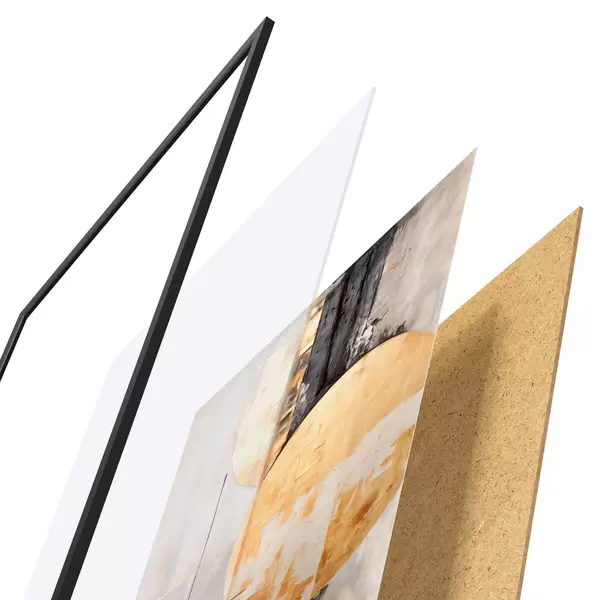 De poster bestaat uit een frame, plexiglas, geprinte afbeelding en spaanplaat achterkant. De poster kan meteen aan de muur worden gehangen dankzij de bevestigingen op de achterkant.