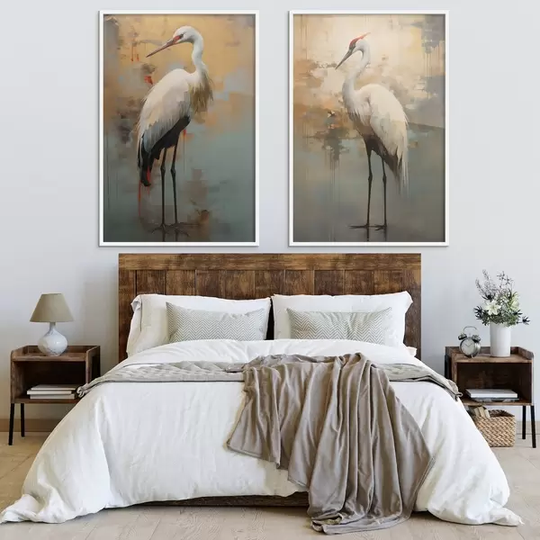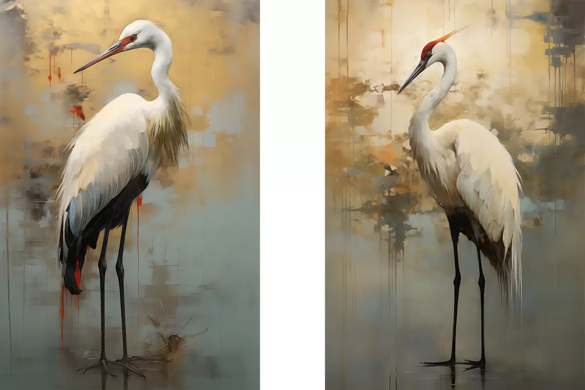 Poster Witte reiger tegen een achtergrond van gedempte gele, bruine en blauwe tinten die een mistig, abstract landschap suggereren N° d00530