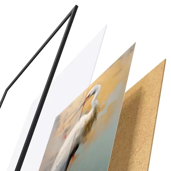 De poster bestaat uit een frame, plexiglas, geprinte afbeelding en spaanplaat achterkant. De poster kan meteen aan de muur worden gehangen dankzij de bevestigingen op de achterkant.