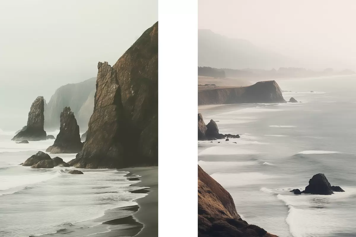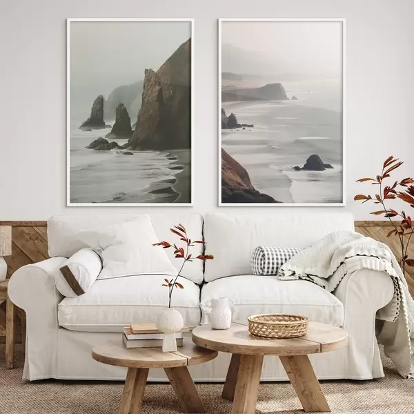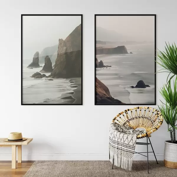 Poster Rotsachtige kliffen en zeekust, golven die op de kust beuken, landschap met een stemmige sfeer, aardetinten N° d00531