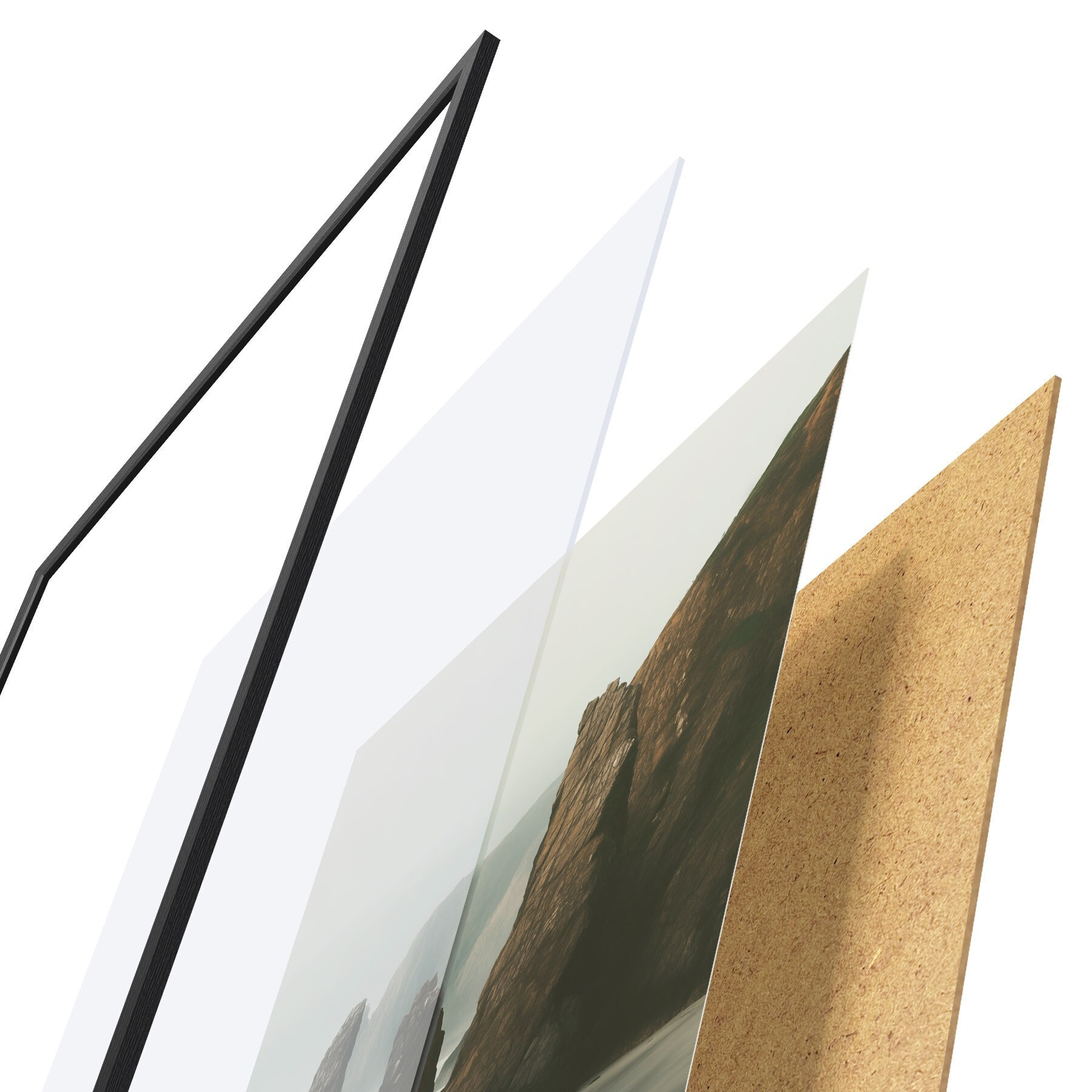 De poster bestaat uit een frame, plexiglas, geprinte afbeelding en spaanplaat achterkant. De poster kan meteen aan de muur worden gehangen dankzij de bevestigingen op de achterkant.