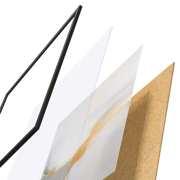 De poster bestaat uit een frame, plexiglas, geprinte afbeelding en spaanplaat achterkant. De poster kan meteen aan de muur worden gehangen dankzij de bevestigingen op de achterkant.
