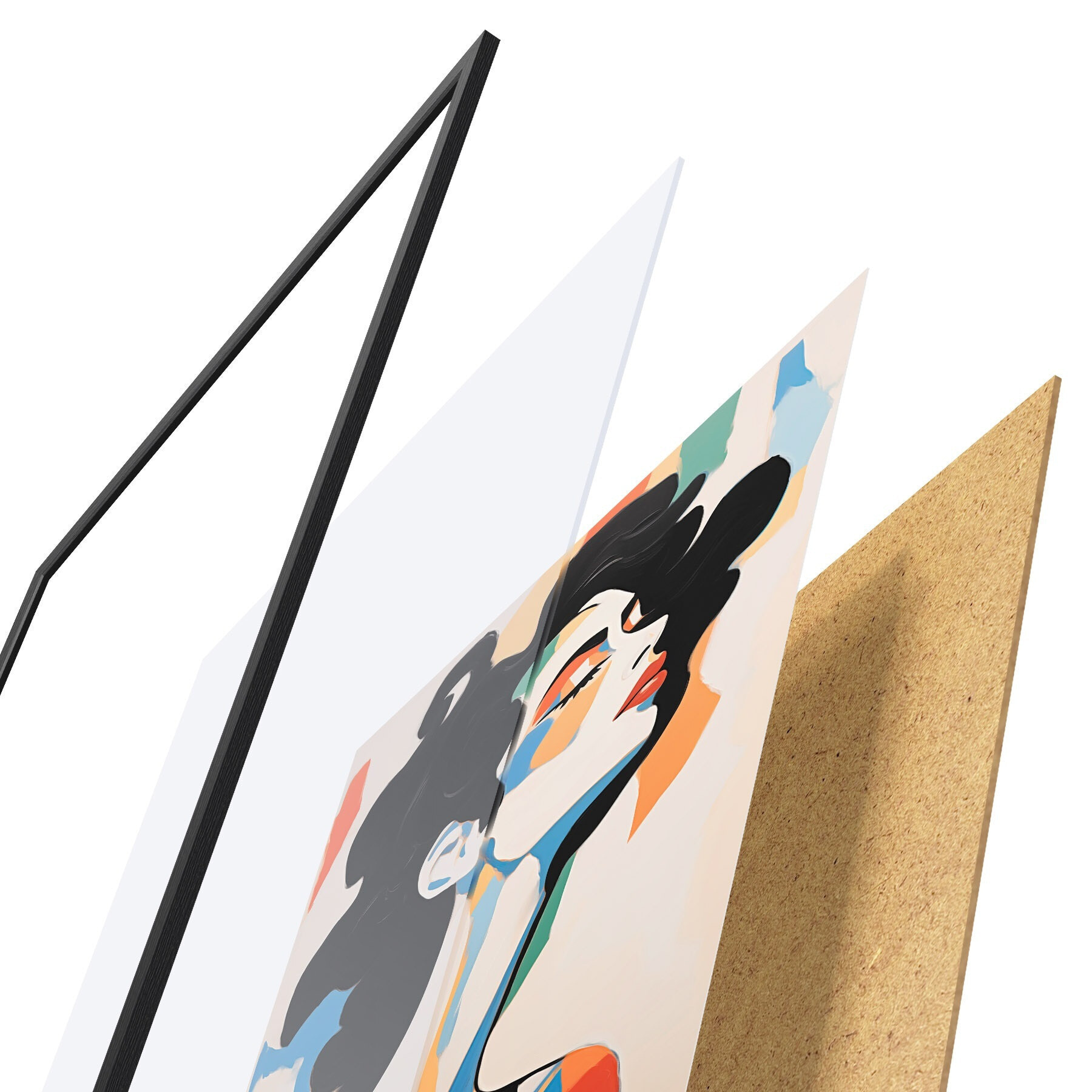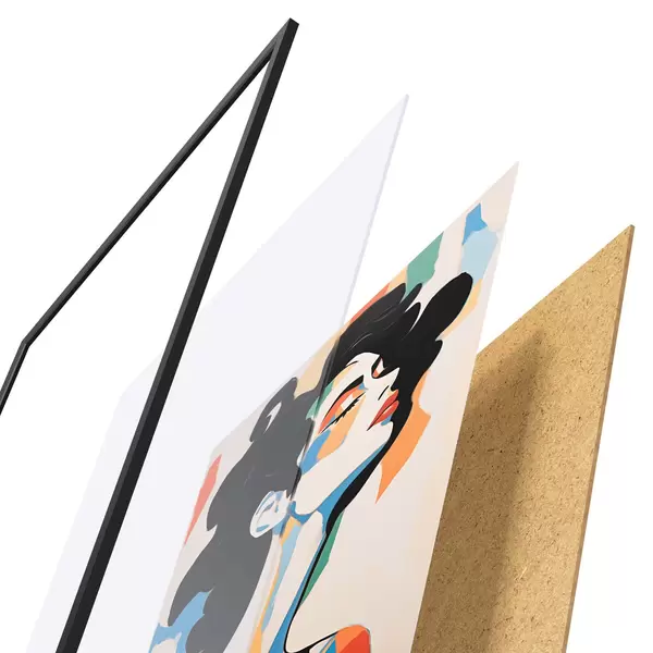 De poster bestaat uit een frame, plexiglas, geprinte afbeelding en spaanplaat achterkant. De poster kan meteen aan de muur worden gehangen dankzij de bevestigingen op de achterkant.