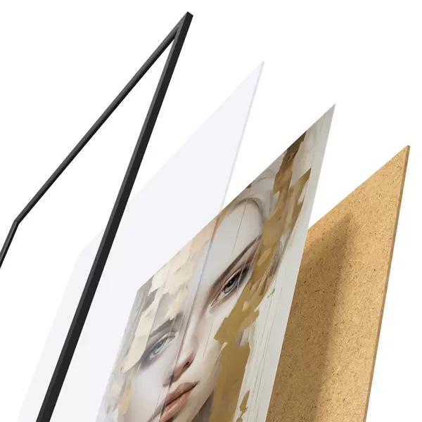 De poster bestaat uit een frame, plexiglas, geprinte afbeelding en spaanplaat achterkant. De poster kan meteen aan de muur worden gehangen dankzij de bevestigingen op de achterkant.