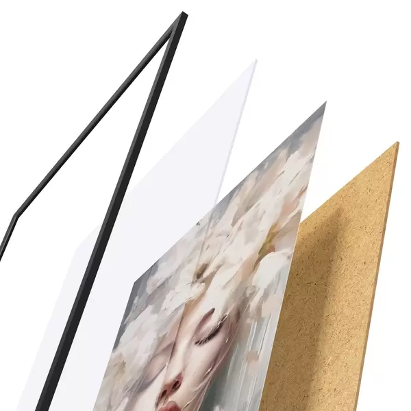 De poster bestaat uit een frame, plexiglas, geprinte afbeelding en spaanplaat achterkant. De poster kan meteen aan de muur worden gehangen dankzij de bevestigingen op de achterkant.