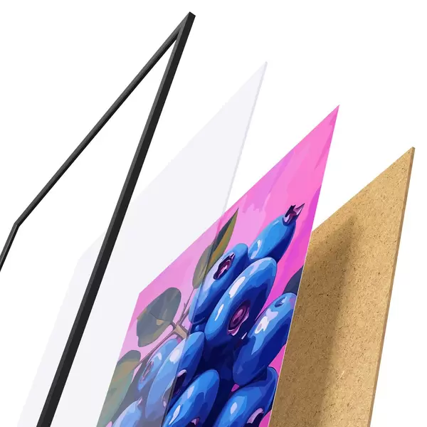 De poster bestaat uit een frame, plexiglas, geprinte afbeelding en spaanplaat achterkant. De poster kan meteen aan de muur worden gehangen dankzij de bevestigingen op de achterkant.