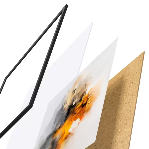 De poster bestaat uit een frame, plexiglas, geprinte afbeelding en spaanplaat achterkant. De poster kan meteen aan de muur worden gehangen dankzij de bevestigingen op de achterkant.