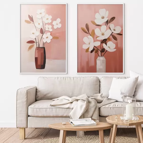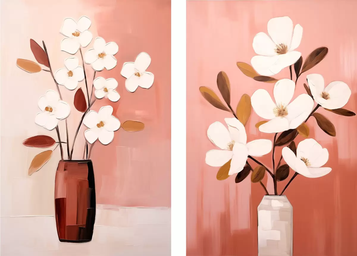 Poster Compositie met contrasterende vazen en witte bloemen met structuur N° d00575