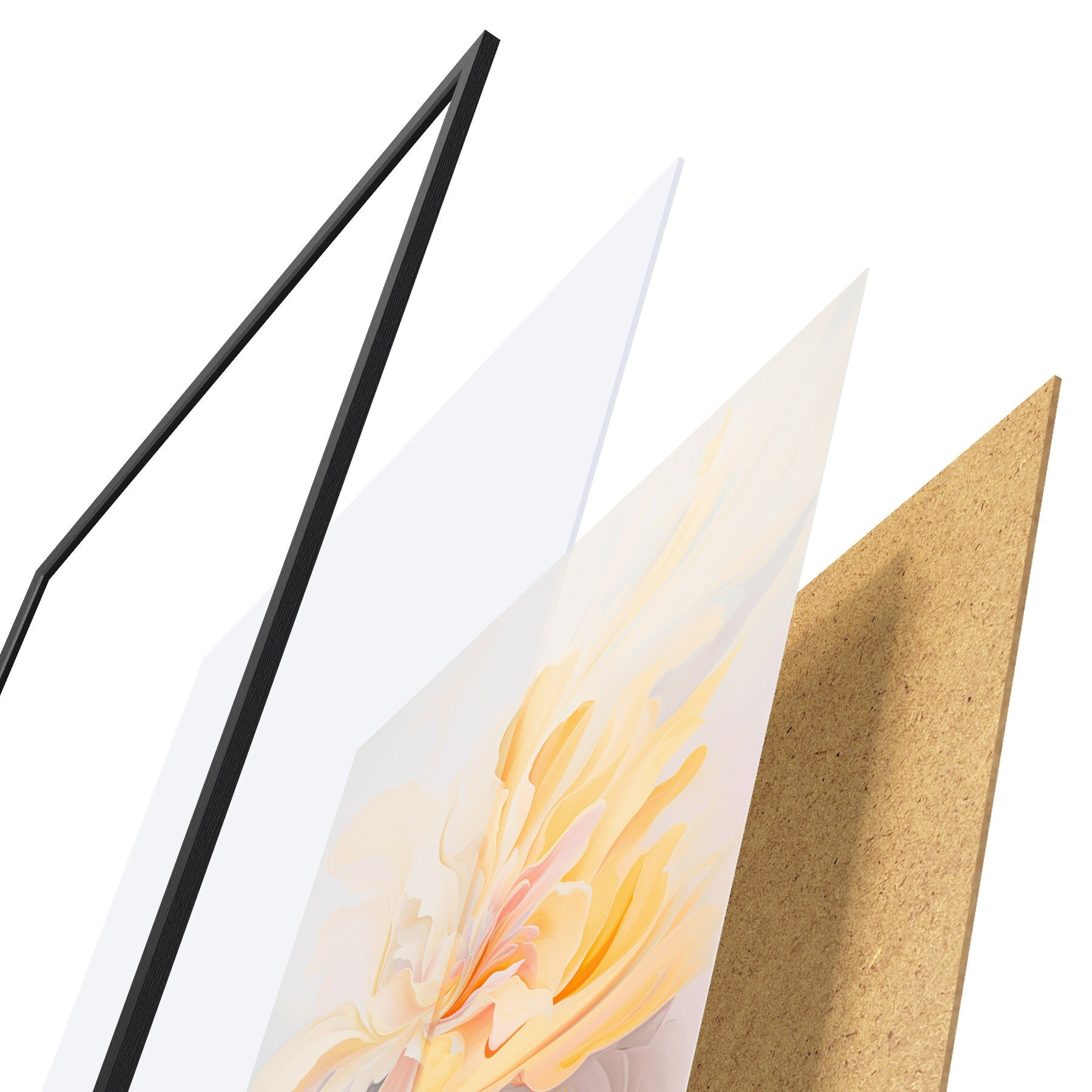 De poster bestaat uit een frame, plexiglas, geprinte afbeelding en spaanplaat achterkant. De poster kan meteen aan de muur worden gehangen dankzij de bevestigingen op de achterkant.