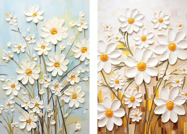 Poster Zonnige bloemen: kunstduet met volumetrische margrieten en gele accenten d00580