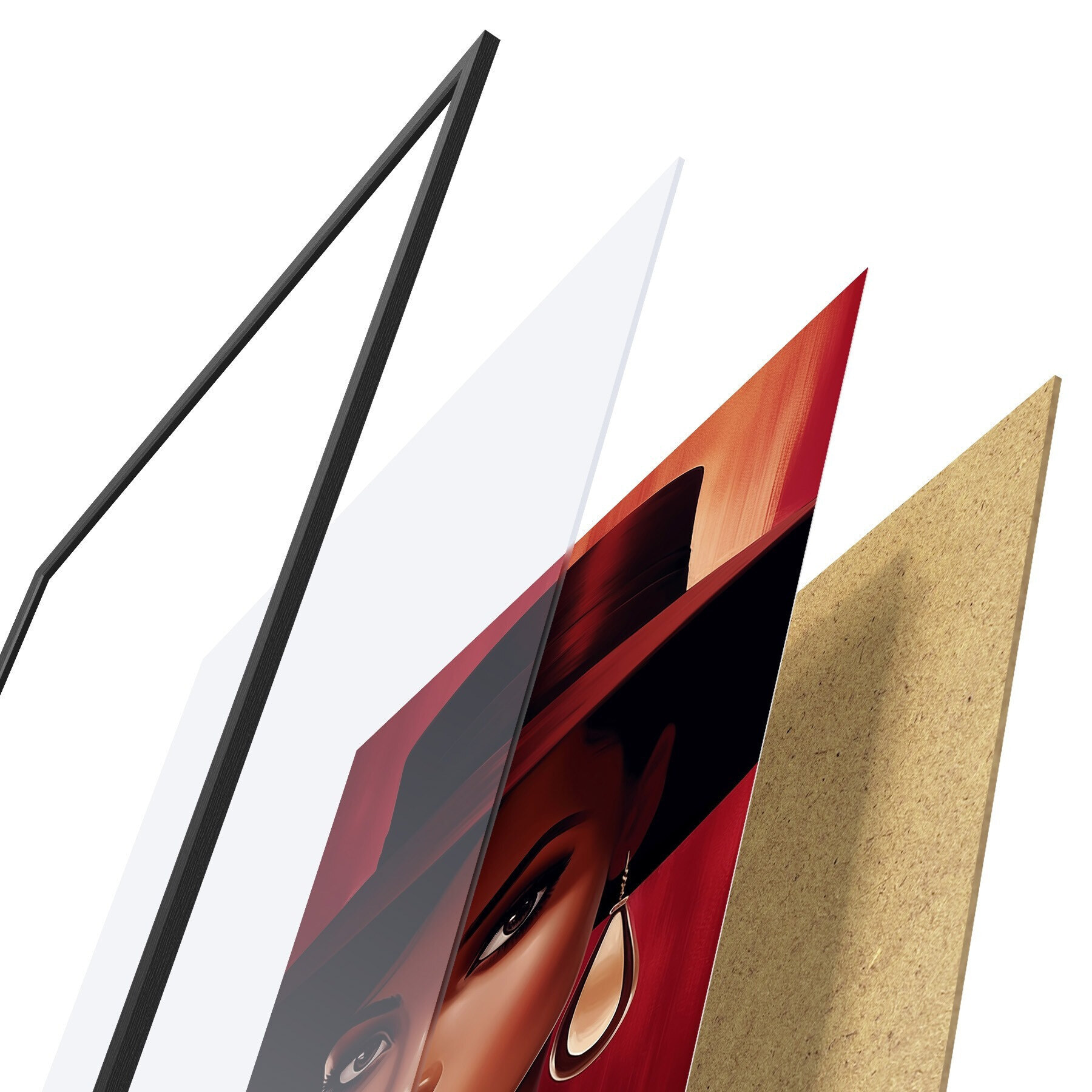 De poster bestaat uit een frame, plexiglas, geprinte afbeelding en spaanplaat achterkant. De poster kan meteen aan de muur worden gehangen dankzij de bevestigingen op de achterkant.