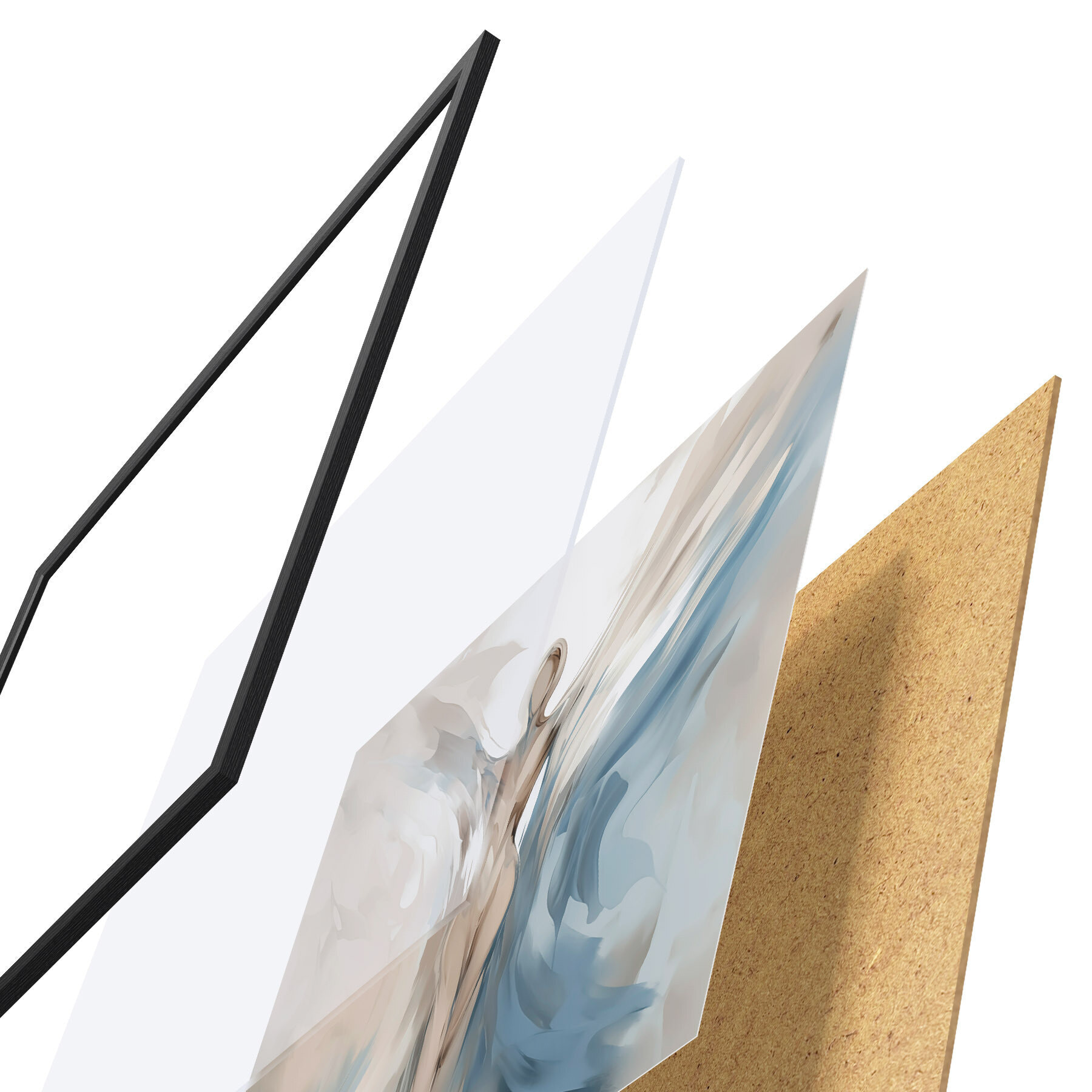 De poster bestaat uit een frame, plexiglas, geprinte afbeelding en spaanplaat achterkant. De poster kan meteen aan de muur worden gehangen dankzij de bevestigingen op de achterkant.