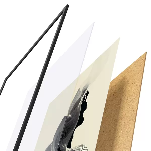 De poster bestaat uit een frame, plexiglas, geprinte afbeelding en spaanplaat achterkant. De poster kan meteen aan de muur worden gehangen dankzij de bevestigingen op de achterkant.