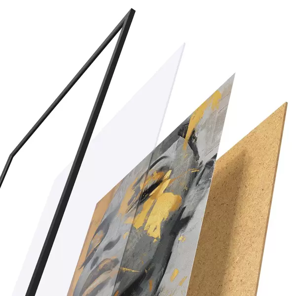 De poster bestaat uit een frame, plexiglas, geprinte afbeelding en spaanplaat achterkant. De poster kan meteen aan de muur worden gehangen dankzij de bevestigingen op de achterkant.