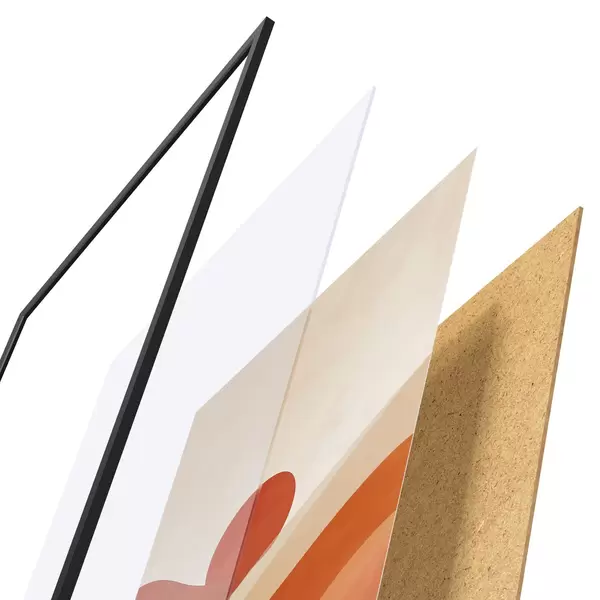 De poster bestaat uit een frame, plexiglas, geprinte afbeelding en spaanplaat achterkant. De poster kan meteen aan de muur worden gehangen dankzij de bevestigingen op de achterkant.