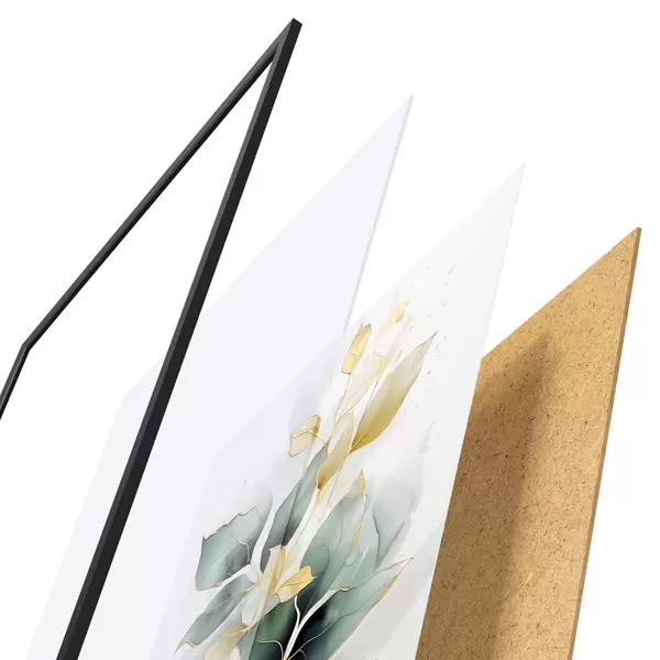 De poster bestaat uit een frame, plexiglas, geprinte afbeelding en spaanplaat achterkant. De poster kan meteen aan de muur worden gehangen dankzij de bevestigingen op de achterkant.