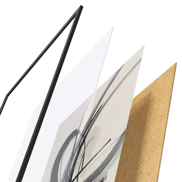 De poster bestaat uit een frame, plexiglas, geprinte afbeelding en spaanplaat achterkant. De poster kan meteen aan de muur worden gehangen dankzij de bevestigingen op de achterkant.