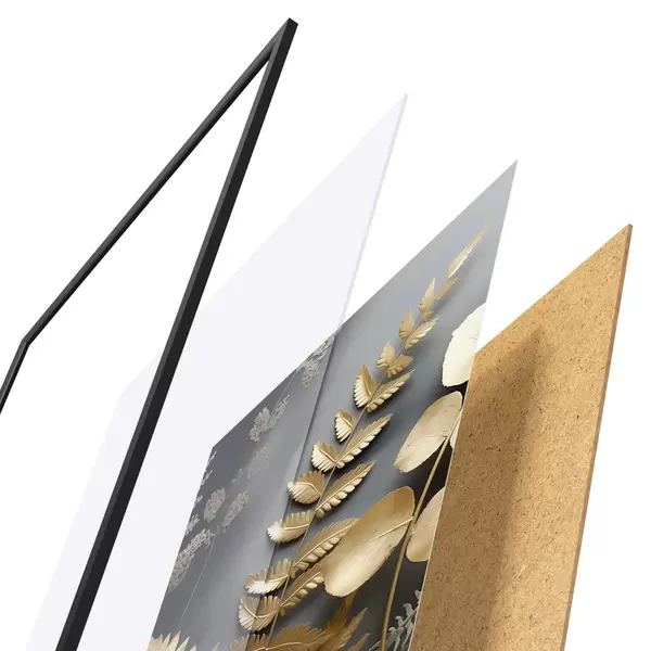 De poster bestaat uit een frame, plexiglas, geprinte afbeelding en spaanplaat achterkant. De poster kan meteen aan de muur worden gehangen dankzij de bevestigingen op de achterkant.