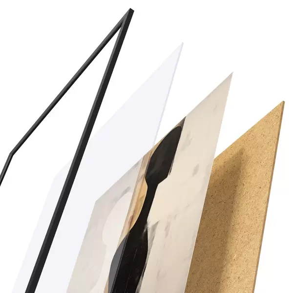 De poster bestaat uit een frame, plexiglas, geprinte afbeelding en spaanplaat achterkant. De poster kan meteen aan de muur worden gehangen dankzij de bevestigingen op de achterkant.