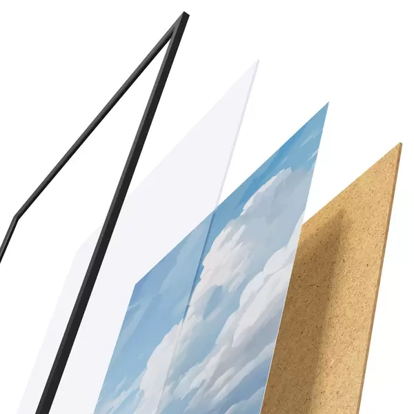 De poster bestaat uit een frame, plexiglas, geprinte afbeelding en spaanplaat achterkant. De poster kan meteen aan de muur worden gehangen dankzij de bevestigingen op de achterkant.