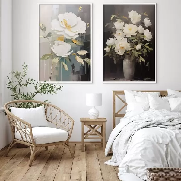 Poster Witte pioenrozen op een donkere achtergrond: decoratieve compositie N° d00634