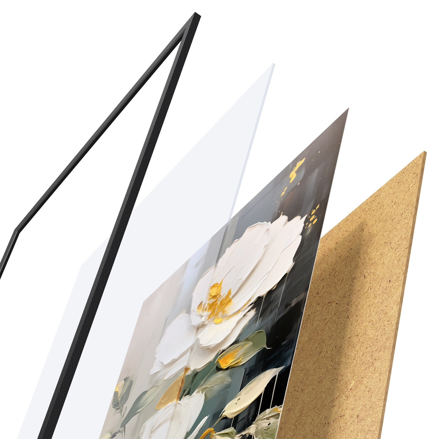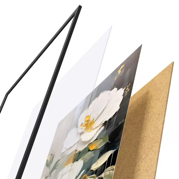 De poster bestaat uit een frame, plexiglas, geprinte afbeelding en spaanplaat achterkant. De poster kan meteen aan de muur worden gehangen dankzij de bevestigingen op de achterkant.