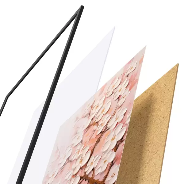 De poster bestaat uit een frame, plexiglas, geprinte afbeelding en spaanplaat achterkant. De poster kan meteen aan de muur worden gehangen dankzij de bevestigingen op de achterkant.