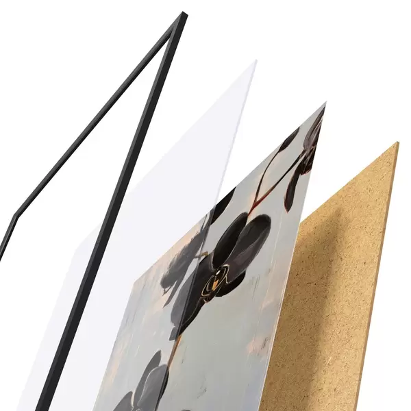 De poster bestaat uit een frame, plexiglas, geprinte afbeelding en spaanplaat achterkant. De poster kan meteen aan de muur worden gehangen dankzij de bevestigingen op de achterkant.