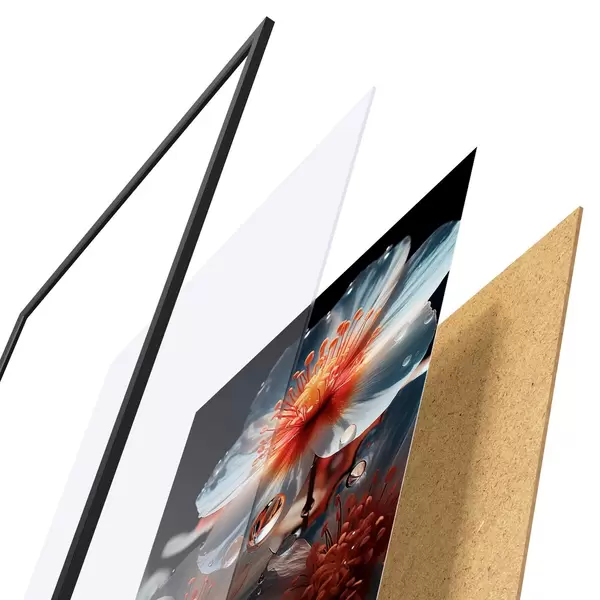 De poster bestaat uit een frame, plexiglas, geprinte afbeelding en spaanplaat achterkant. De poster kan meteen aan de muur worden gehangen dankzij de bevestigingen op de achterkant.