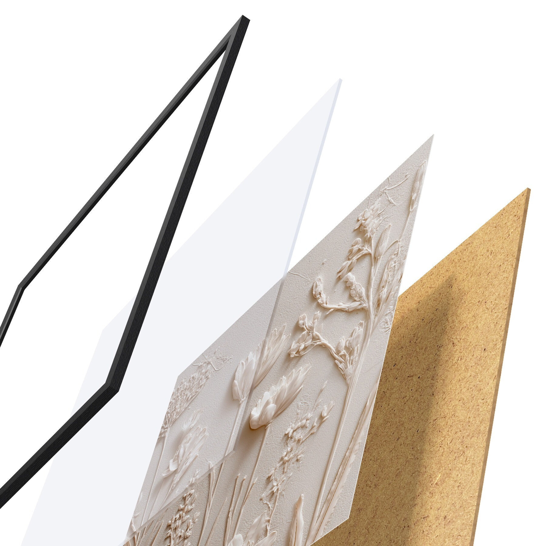 De poster bestaat uit een frame, plexiglas, geprinte afbeelding en spaanplaat achterkant. De poster kan meteen aan de muur worden gehangen dankzij de bevestigingen op de achterkant.