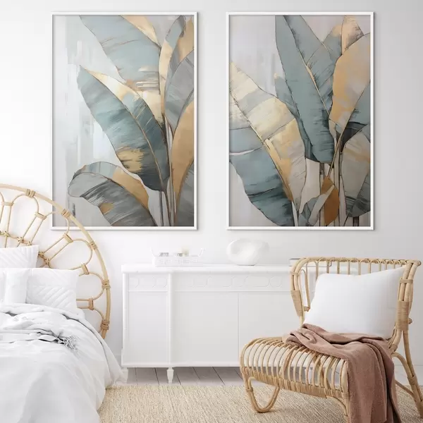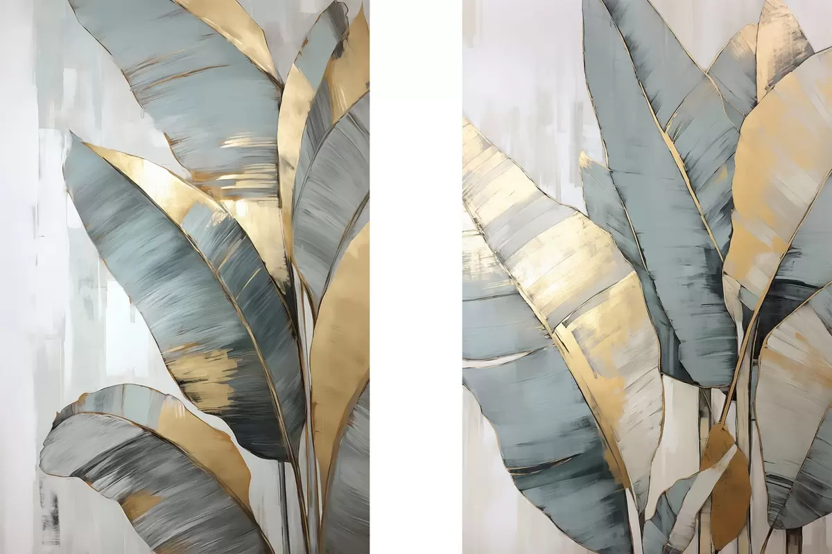 Poster Een set gedempte blauwe, grijze en gele bananenbladeren met zichtbare penseelstreken, op een witte abstracte achtergrond N° d00645