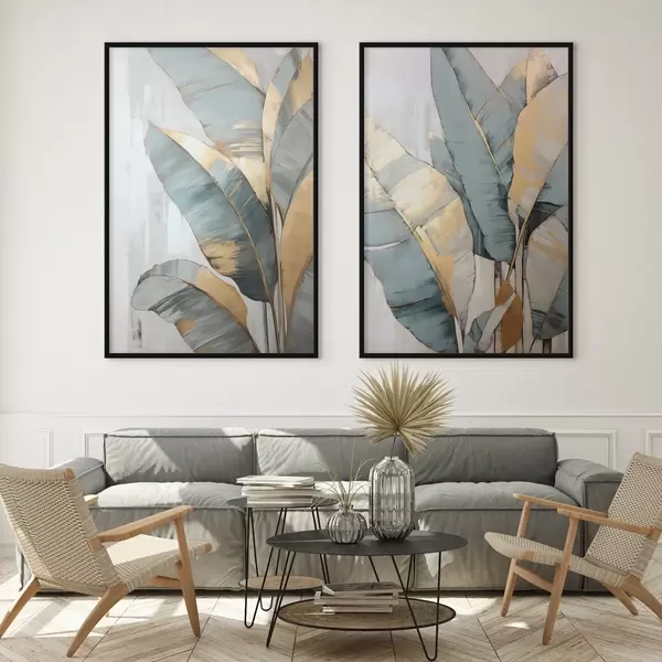 Poster Een set gedempte blauwe, grijze en gele bananenbladeren met zichtbare penseelstreken, op een witte abstracte achtergrond d00645
