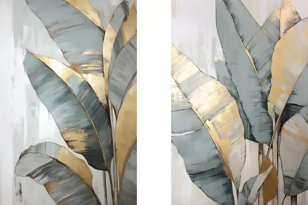 Poster Een set gedempte blauwe, grijze en gele bananenbladeren met zichtbare penseelstreken, op een witte abstracte achtergrond d00645