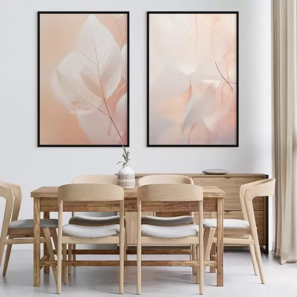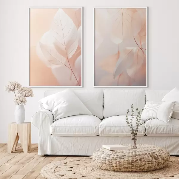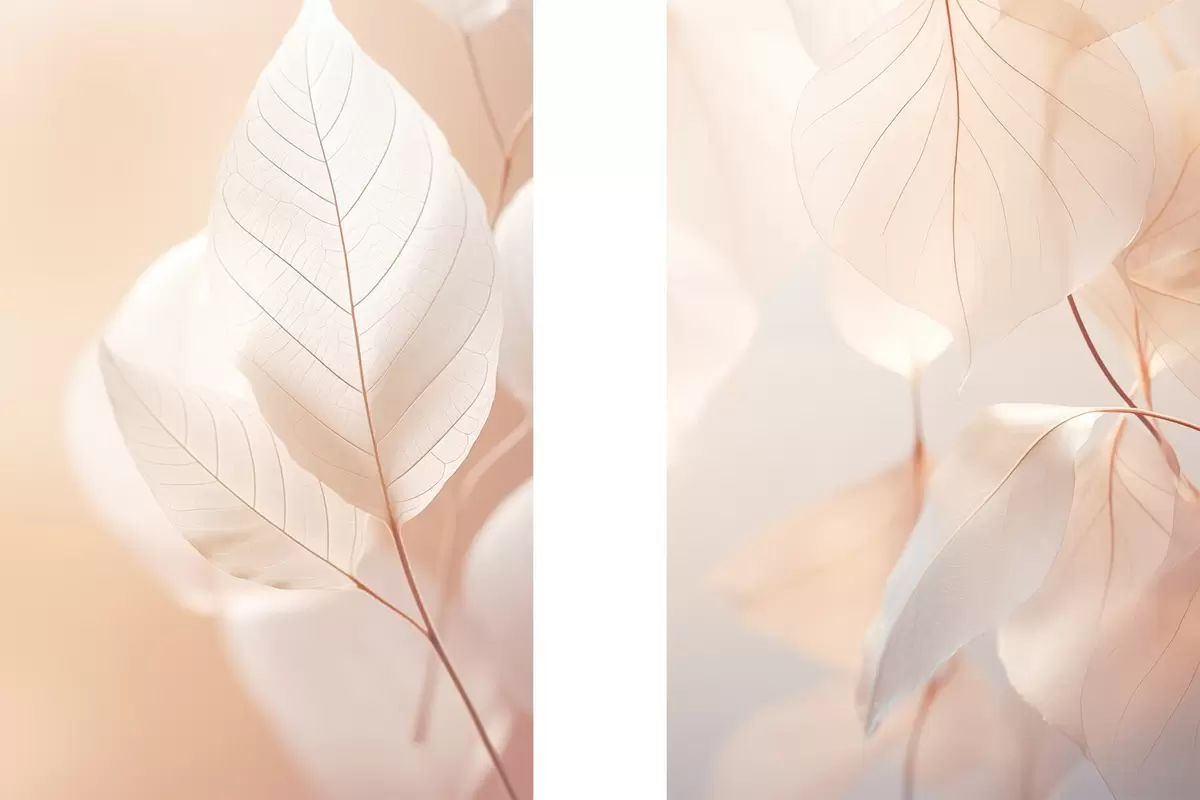 Poster Close-up van doorschijnende bladeren met fijne nerven, zacht perzik en wit kleurenpalet, onscherpe achtergrond N° d00647