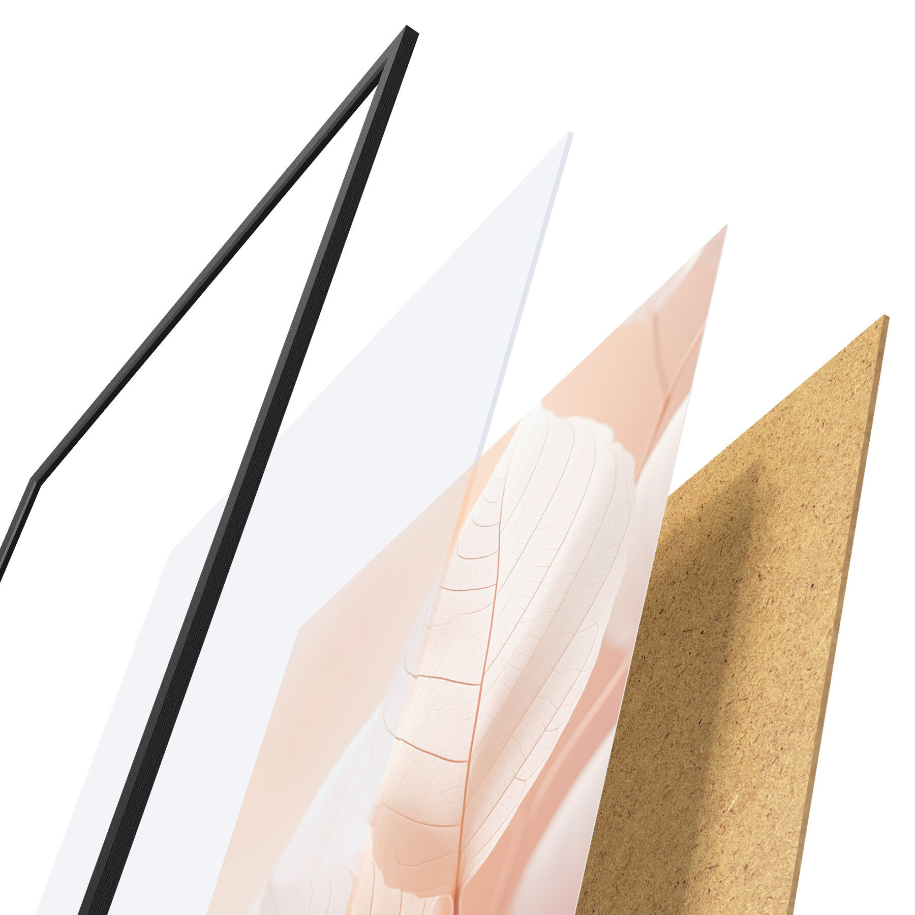 De poster bestaat uit een frame, plexiglas, geprinte afbeelding en spaanplaat achterkant. De poster kan meteen aan de muur worden gehangen dankzij de bevestigingen op de achterkant.