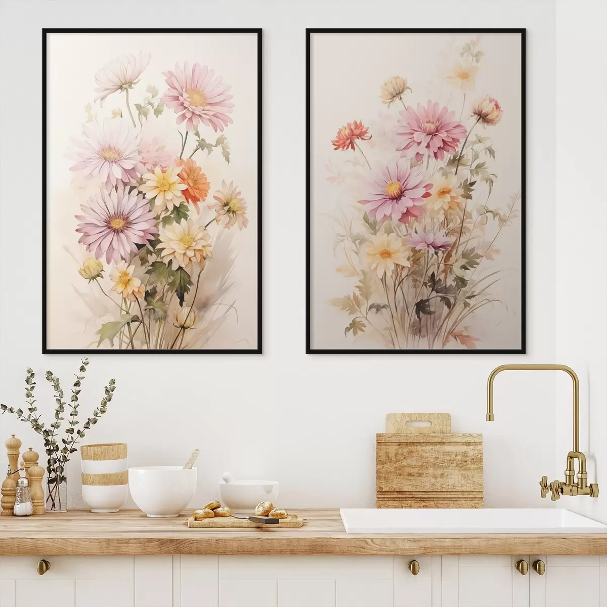 Poster Een boeket kleurrijke bloemen, zachte aquarel stijl, op een lichte achtergrond, botanische illustratie d00649