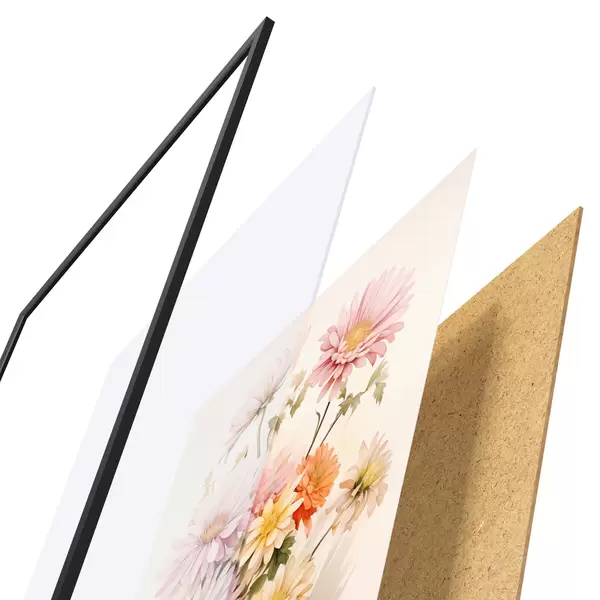 De poster bestaat uit een frame, plexiglas, geprinte afbeelding en spaanplaat achterkant. De poster kan meteen aan de muur worden gehangen dankzij de bevestigingen op de achterkant.