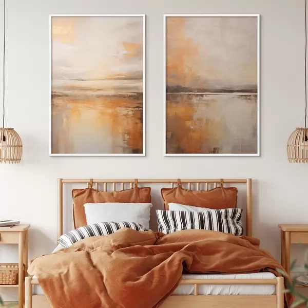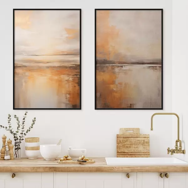 Poster Een abstract schilderij van een strandlandschap met een kalme oceaan, oranje zand en een bewolkte lucht met zon N° d00653