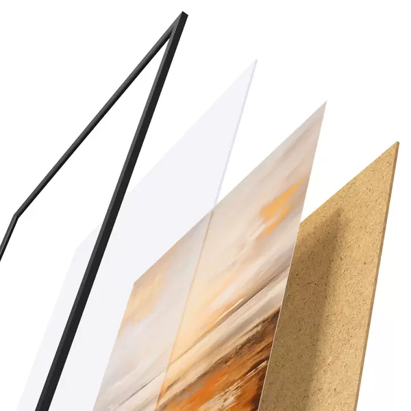 De poster bestaat uit een frame, plexiglas, geprinte afbeelding en spaanplaat achterkant. De poster kan meteen aan de muur worden gehangen dankzij de bevestigingen op de achterkant.