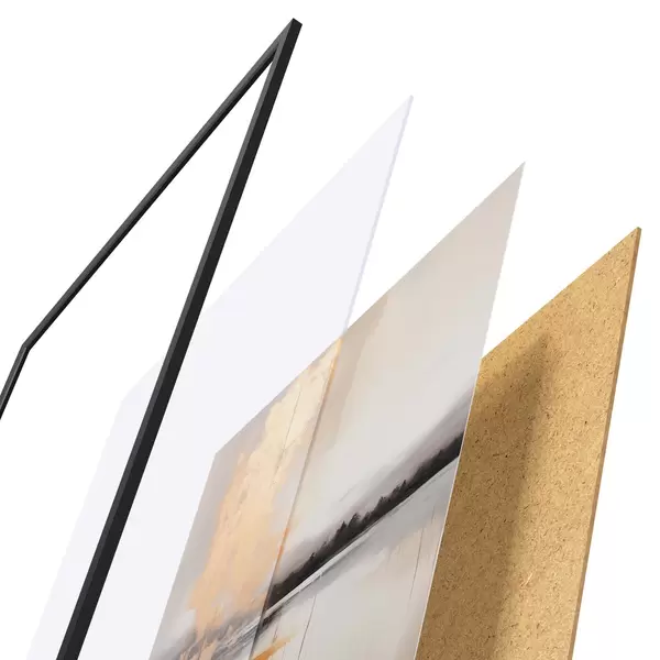 De poster bestaat uit een frame, plexiglas, geprinte afbeelding en spaanplaat achterkant. De poster kan meteen aan de muur worden gehangen dankzij de bevestigingen op de achterkant.