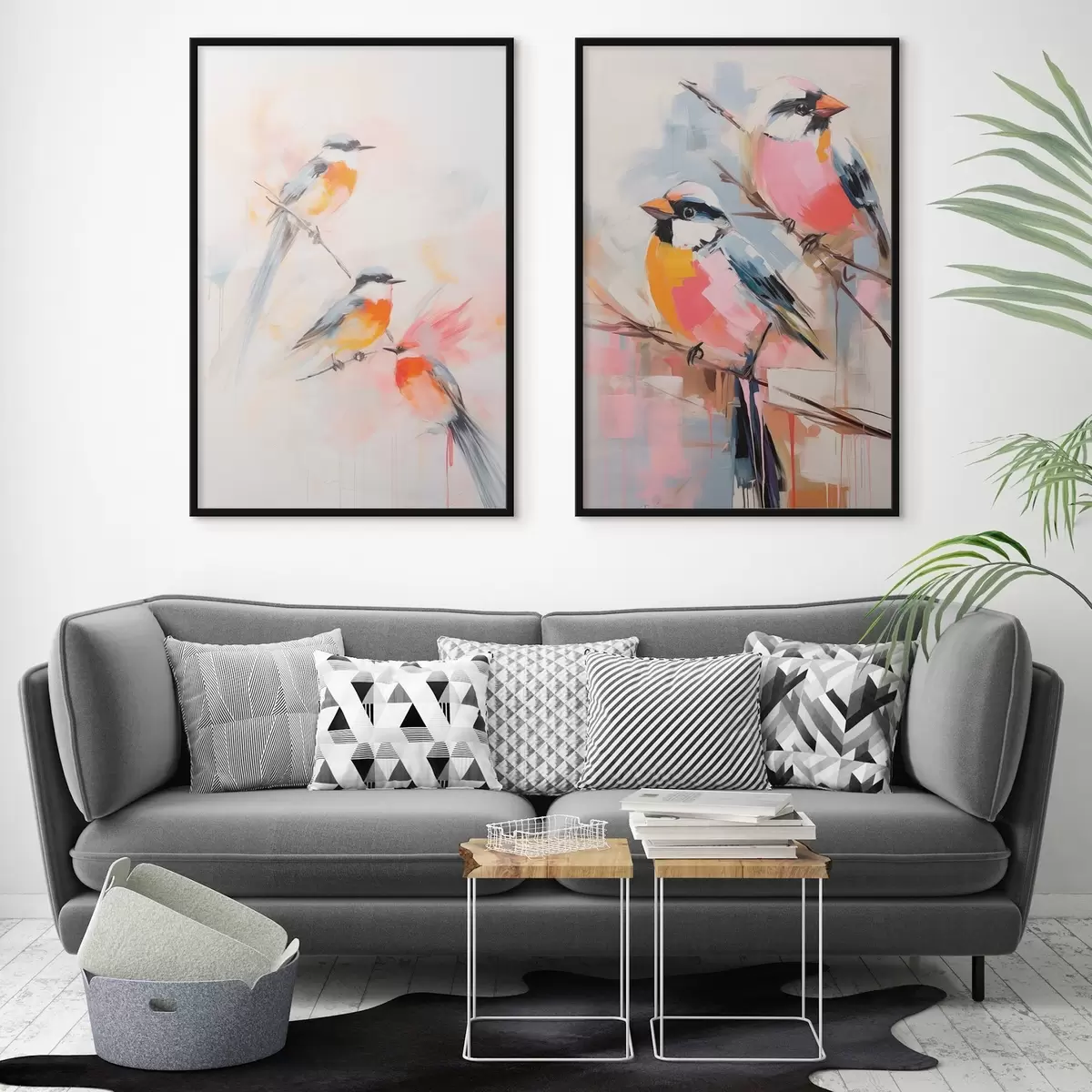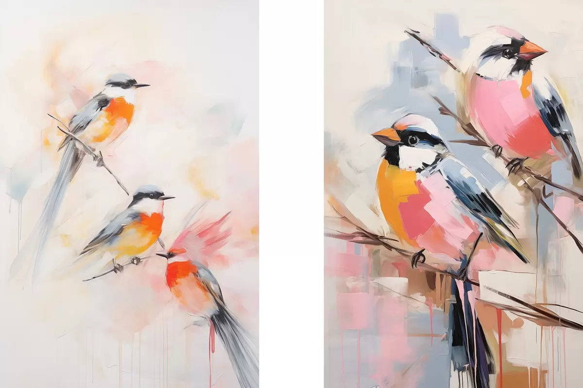 Poster Vogels neergestreken op takken , zachte pastelkleuren, lichte achtergrond met roze en witte tinten N° d00658