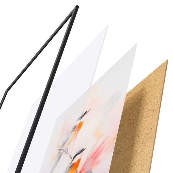De poster bestaat uit een frame, plexiglas, geprinte afbeelding en spaanplaat achterkant. De poster kan meteen aan de muur worden gehangen dankzij de bevestigingen op de achterkant.