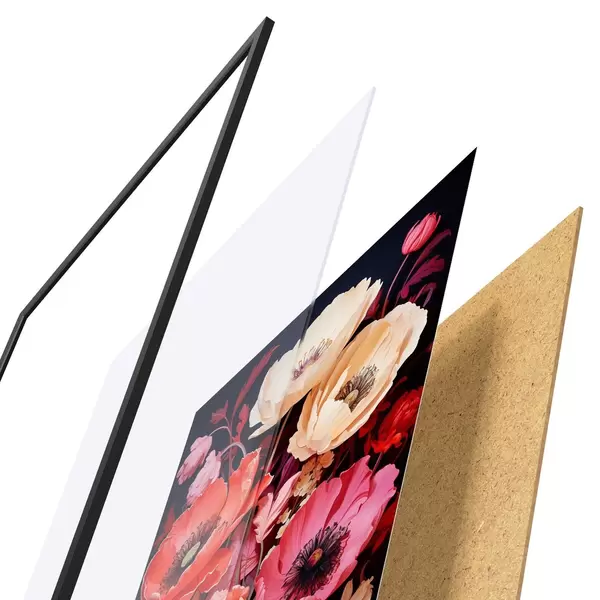 De poster bestaat uit een frame, plexiglas, geprinte afbeelding en spaanplaat achterkant. De poster kan meteen aan de muur worden gehangen dankzij de bevestigingen op de achterkant.