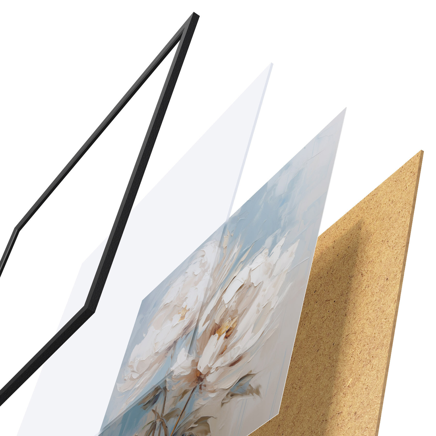 De poster bestaat uit een frame, plexiglas, geprinte afbeelding en spaanplaat achterkant. De poster kan meteen aan de muur worden gehangen dankzij de bevestigingen op de achterkant.