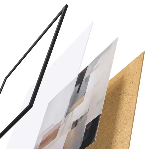 De poster bestaat uit een frame, plexiglas, geprinte afbeelding en spaanplaat achterkant. De poster kan meteen aan de muur worden gehangen dankzij de bevestigingen op de achterkant.