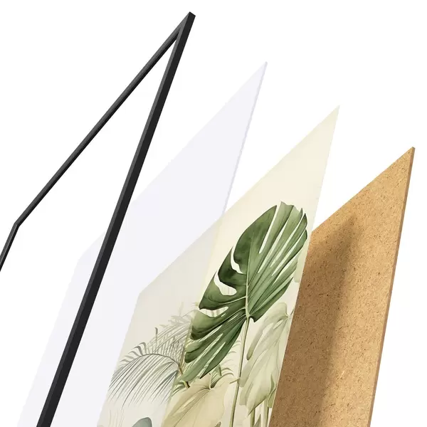 De poster bestaat uit een frame, plexiglas, geprinte afbeelding en spaanplaat achterkant. De poster kan meteen aan de muur worden gehangen dankzij de bevestigingen op de achterkant.
