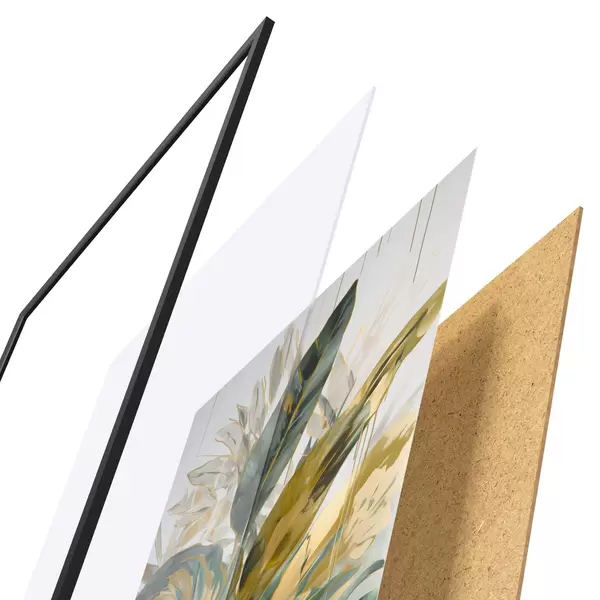 De poster bestaat uit een frame, plexiglas, geprinte afbeelding en spaanplaat achterkant. De poster kan meteen aan de muur worden gehangen dankzij de bevestigingen op de achterkant.